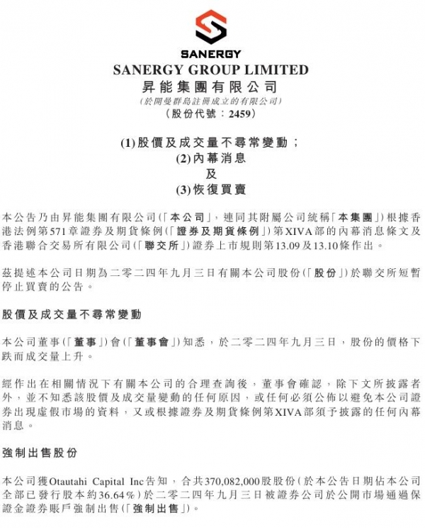升能集团表示,公司获Otautahi Capital Inc告知,约3.7亿股股份(约占已发行股本的36.4%)在3日被证券公司于公开市场通过保证金证券账户强制出售。强制出售完成后,Otautahi Capital Inc持有的股份数量约2.12亿股,约占已发行股本的21.02%。