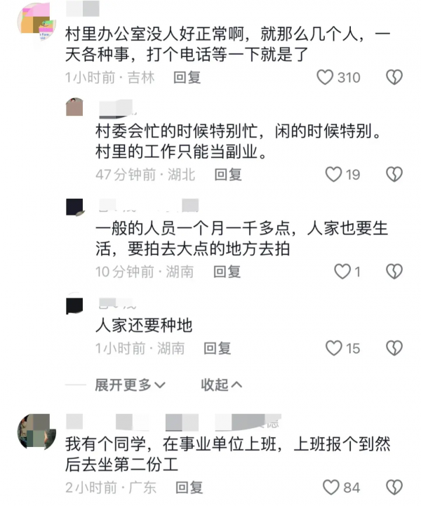 有网友说,没什么大惊小怪的,村里办公室没人好正常啊,就那么几个人,一天各种事,打个电话等一下就是了。