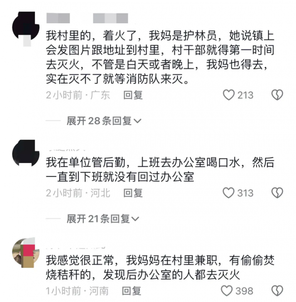 有网友说,我村里的,着火了,我妈是护林员,她说镇上会发图片跟地址到村里,村干部就得第一时间去灭火,不管是白天或者晚上,我妈也得去,实在灭不了就等消防队来灭。