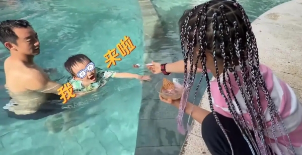 当然郑恺闲下来的时候,也会一起带娃。比如这次旅行,就是全家人一起的体验。郑恺抱着儿子在游泳池玩耍,苗苗则负责在岸上看着女儿。