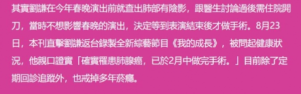 刘谦说自己的病情并不是很严重,还处在0期,手术治疗很成功,心情还算可以,是因为前一段时间刘谦的小叔因为肺癌去世了,加上他有抽烟的坏习惯,所以才会这么早决定做手术。