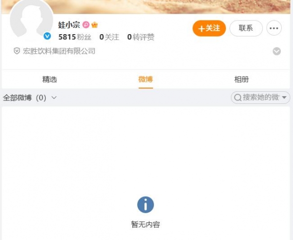目前,"娃小宗"已在注册微博账号,认证的企业为宏胜饮料集团有限公司,审核时间是9月30日,,尚未发布任何内容。