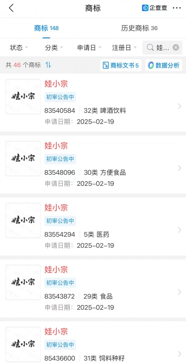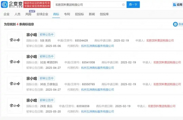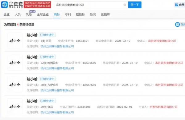 尽管辞去娃哈哈职务,宗馥莉仍通过"宏胜系"掌控约200家企业。细心网友发现,今年2月至5月宏胜集团已申请注册45件"娃小宗"商标,覆盖食品、饮料、餐饮等多个类别,同期还申请了"宗小哈""娃小哈"等商标,显然早已为"单飞"铺路。