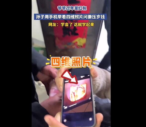 视频中,爷爷过年给晚辈发红包,孙子用手机举着思维照片给爷爷百年要压岁钱。