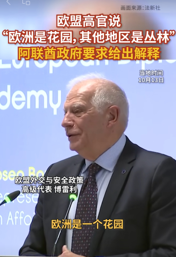 欧盟前外交与安全政策高级代表博雷利曾有一句震惊四座的言论:"欧洲是花园,是人类能够建立的政治自由、经济繁荣和社会凝聚力的最佳组合,而世界其它地方大部分是丛林,丛林可能入侵花园。"