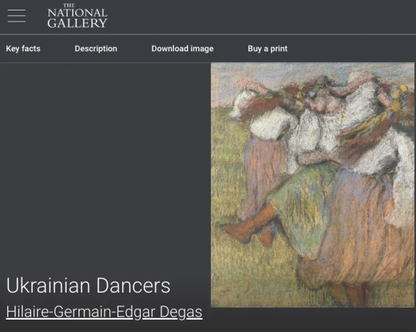 西方甚至连同俄罗斯有关的画儿、猫儿、树儿也要制裁。伦敦国家美术馆2023年将法国印象派画家德加的画作《俄罗斯舞者》更名为《乌克兰舞者》,这幅画描绘三名系蓝黄丝带的舞者,美术馆称 "蓝黄两色象征乌克兰国旗",故而更名。可问题是,该画创作于1899年,当时乌克兰属俄罗斯帝国,"乌克兰国旗"尚不存在。