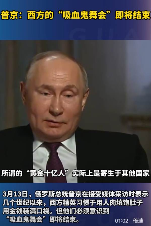 和美西方撕破脸后,普京在国际场合上频频提及"黄金十亿"这个词,强调说,所谓"黄金十亿"国家(指的是人口约10亿的西方国家)企图维系对世界的统治地位,对他国干涉主权、盘剥经济利益并强加外来价值观,这种政策破坏国际关系稳定,阻碍全人类发展。