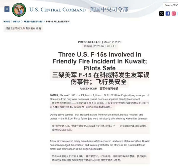 据悉,在伊朗的苏-24被打下来的同一天,3架美军的F-15战机在科威特坠毁,飞行员全部弹射逃生。伊朗中央司令部表示,这是伊朗防空系统的"杰作",但很快,美国中央司令部跳出来反驳,称这3架F-15是被科威特的防空系统"误击"了(图2),跟伊朗没关系。