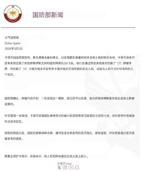 当地时间3月2日,卡塔尔国防部发表通告(图1),宣布本国空军成功击落了来自伊朗的两架苏-24战机。