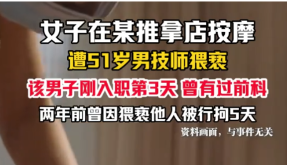 广东广州,一女子下班后去按摩店放松一下,谁知竟被51岁男技师摸了臀部后,又被摸了下体。女子顿感羞恼,在制止男技师的行为后选择了报警。万万没想到,这男技师此前竟因猥亵他人,被行政拘留过5日,是个惯犯。案发后,女子要求按摩店给个说法,但老板只同意给女子免单,不同意额外赔偿。