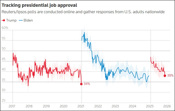 路透社/益普索(Ipsos)14日至17日对1017名成年人进行的民调显示,特朗普的支持率降至38%,为他重返白宫以来的最低水平,误差幅度约为3个百分点。与11月初的同一调查相比,特朗普的总体支持率下降了2个百分点。
