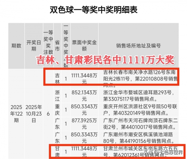 双色球第25122期一等奖明细介绍!吉林、甘肃彩民双双喜中1111万元大奖