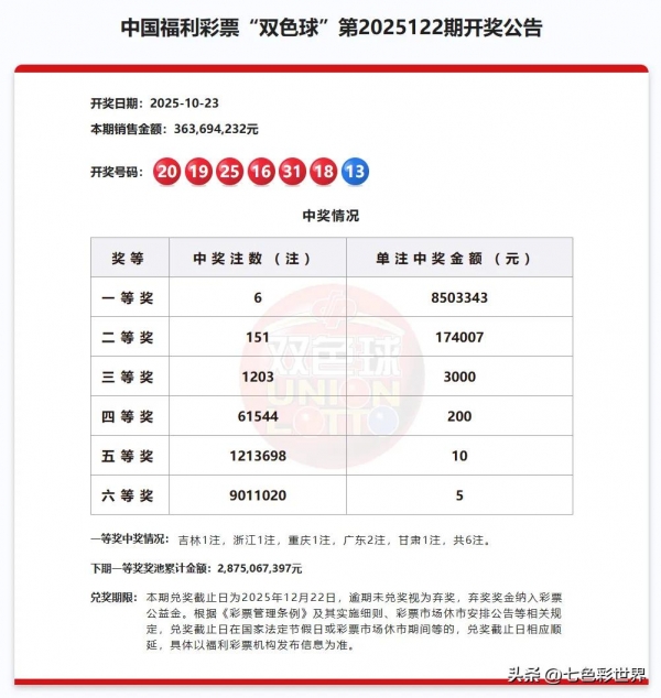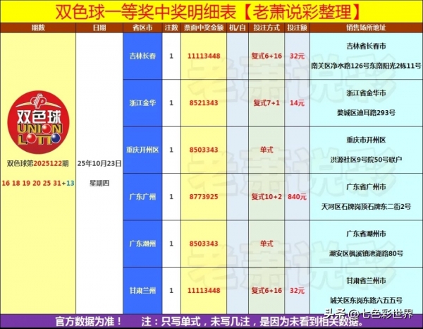 好了,以上就是双色球第25122期一等奖明细介绍,感谢您的阅读,我们下期再会!最后依旧是温馨提示:购彩有风险,请量力而行!