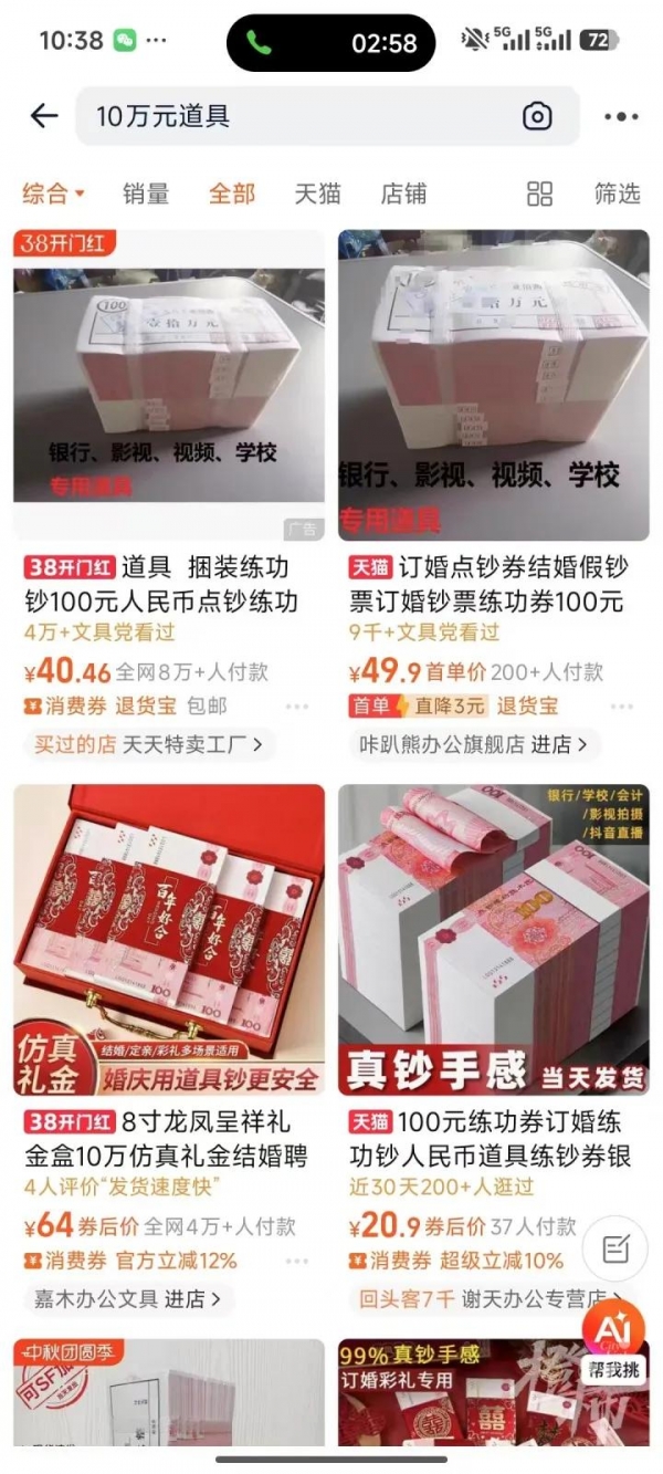 随后,姚越操在网购平台搜索"10万元道具",出现了一批价值20-60元不等的人民币道具,他发现,有一家的道具实拍图上面也有封签和红章,"就连盖的工作人员的姓名章和行李箱里的也一模一样。"
