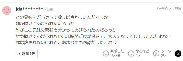 "究竟要如何才能拯救这对兄妹?有没有人伸出过援手?政府在哪里?这些孩子在无人过问的角落里消耗着生命……纵使行凶不可饶恕,但这世界对他们也太过残酷了。"