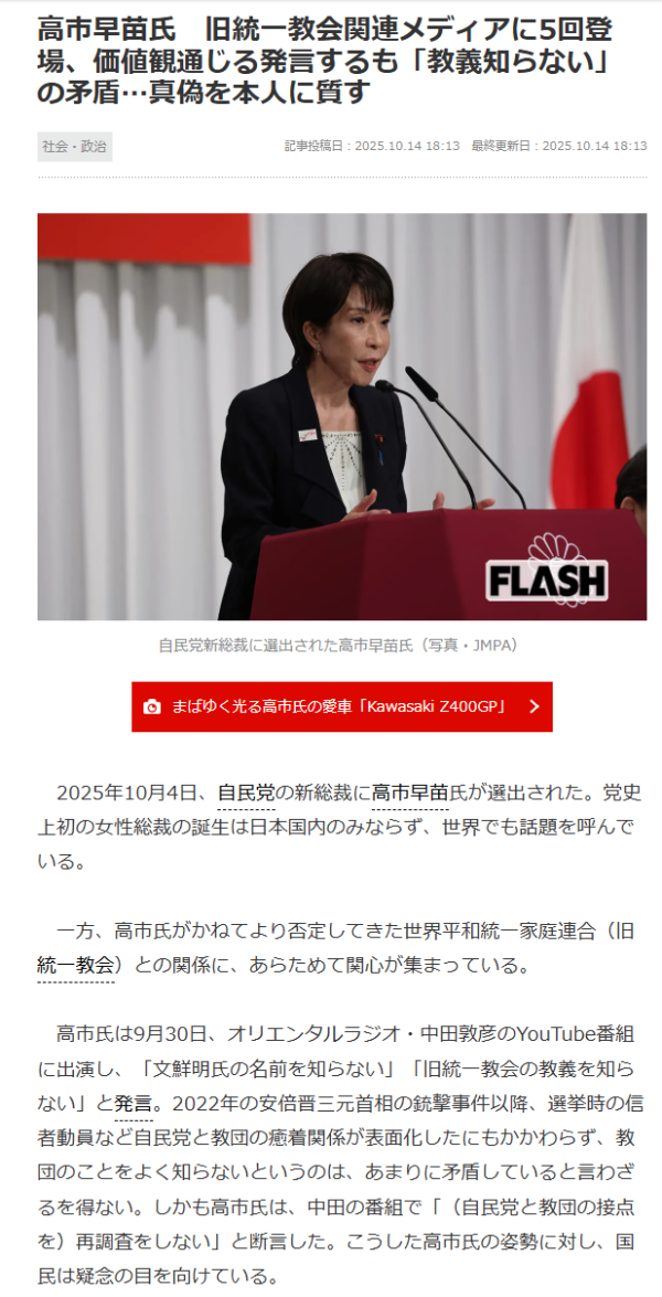 然而,历史是有记忆的。日媒《Flash》与《赤旗报》早已扒得干干净净:高市早苗不仅在长达近20年的时间里,多次出现在统一教旗下《世界日报》和杂志《Viewpoint》的版面上,甚至在这个"反日"教团的媒体上大谈"家庭中心主义"和"家父长制"。