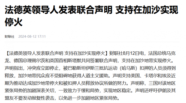 根据美国白宫方面发布的声明,上述五国领导人近期讨论了中东地区的局势,并且就缓解加沙冲突、达成停火协议以及释放被扣押人质方面达成了共识,并且表示呼吁各方尽快重启谈判。