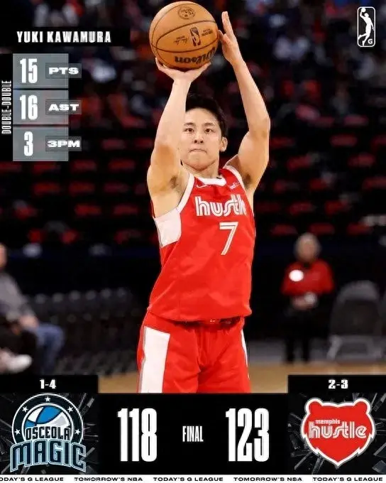 11月21日NBA发展联盟比赛,孟菲斯拼搏队以123-118战胜了莱克兰魔术队,代表拼搏队出战的河村勇辉此役命中3记三分,拿到15分,并送出惊人的16次助攻为球队取胜发挥重要作用。