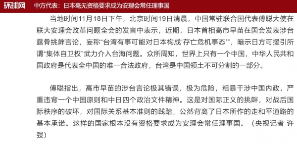 据环球网报道,19日凌晨,中国代表在联大上发言,当场罗列了高市早苗的4宗罪,最后彻底把话说透,坦言日本没有资格成为安理会常任理事国。
