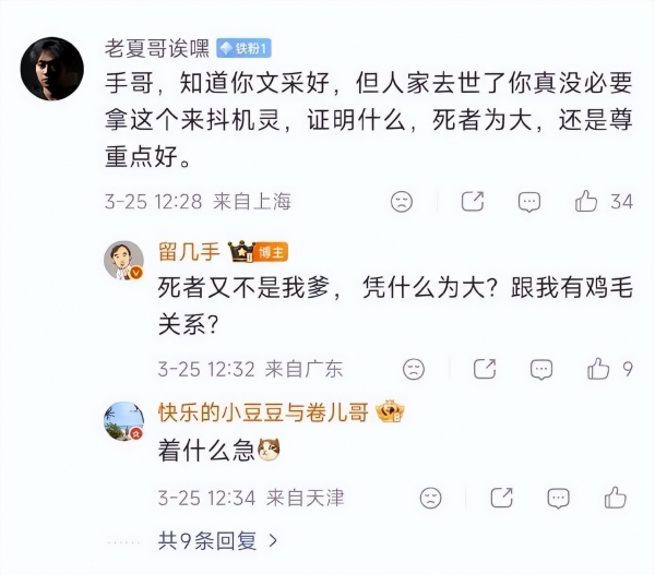 留几手的发文和回复彻底惹怒了网友,大家认为他"为流量突破道德底线""消费逝者""冷漠无情"。