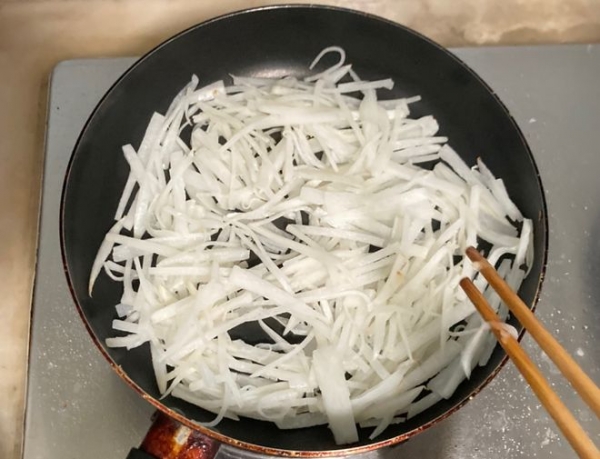 等鸡蛋煎好后盛出,将白萝卜丝倒进锅内,翻炒几下,微微变软后加适量水。