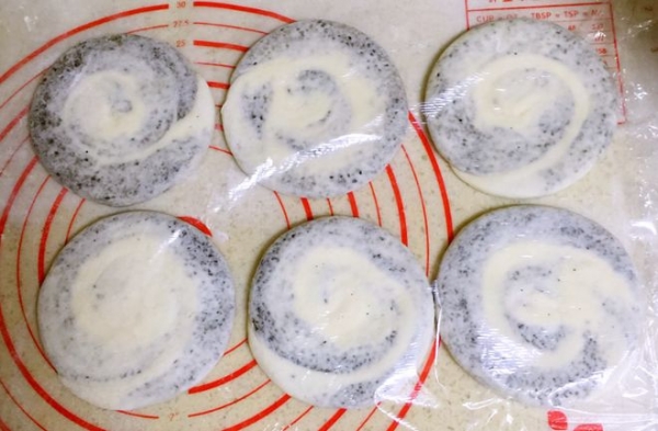 取一个剂子擀薄,放上适量黑芝麻馅,从一端卷起,卷好后再盘起来,稍微擀薄一些,放一边醒面。