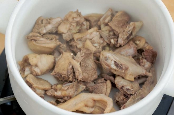 将浮沫撇干净后捞出鸭块,再将鸭块倒进砂锅内,倒入足量热水,放入几片生姜。