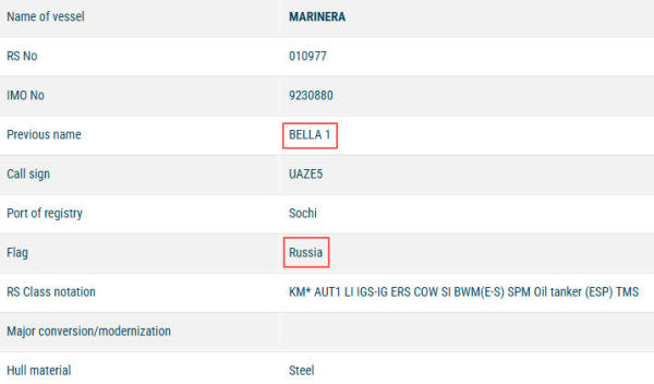 稍早时候,"贝拉1"号宣称享有俄罗斯船籍,并改名"马里内拉"(Marinera)号。