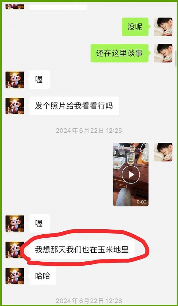 为了证明自己举报信息的真实性,男子还曝光了几张女房东与他的微信聊天截图,信息显示,女房东让男子发照片给她看看,男子没有回应,女房东接着先是发了一段不雅视频挑逗男子,接着对男子说:我想那天我们也在玉米地里。