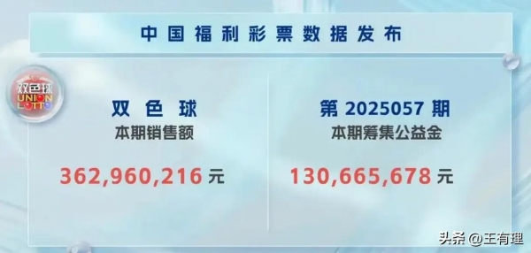 本期双色球全国销售总额3.62亿元,为国家募集公益金1.3亿元。