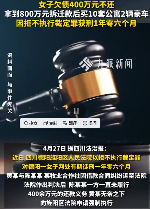法院核查发现,2024年6月至9月,陈某某实际控制的某牧业合作社陆续收到了800万余元的拆迁补偿款。但陈某某收到款项后,既未向法院如实申报财产,也未履行还款义务,反而操控合作社将补偿款转移至本人及儿子王某某名下,并让王某某用这笔钱在成都购买10套公寓、2辆奔驰豪车。