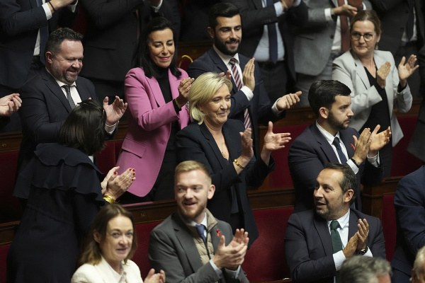 法国国民议会通过对政府的不信任动议,勒庞鼓掌(金色短发者)。视觉中国
