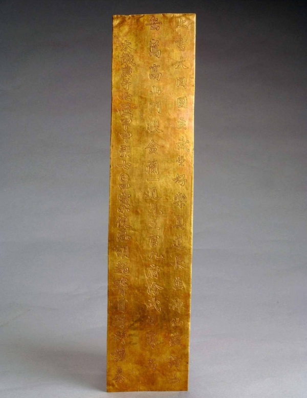 "大周国主武曌好乐真道长生神仙,谨诣中岳嵩高山门,投金简一通,乞三官九府除武曌罪名,太岁庚子七月甲申朔七日甲寅小使臣胡超稽首再拜谨奏。"