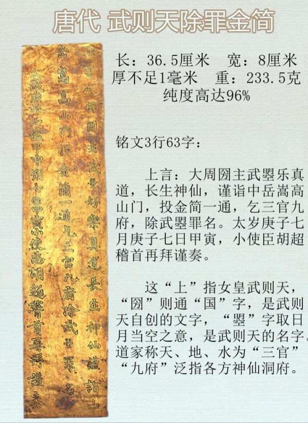 除罪金简流行于唐五代时期,是用来祈福禳灾的信物。而武则天除罪金简,是迄今为止发现的唯一古代金简,以前只发现过封建帝王祭祀名山大川时投下的玉简和银简。