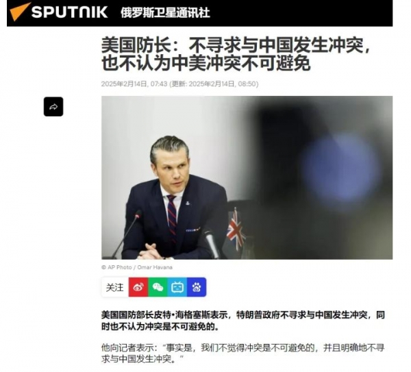 2025年2月14日,美国国防部长海格赛斯在五角大楼市政厅会议中,针对对华军事政策方案中表示: