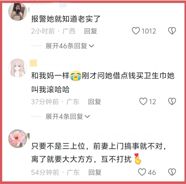 也有网友表示这样一看,当初离婚原因不就找到了?结婚时拼命作,离婚时,拼命闹,当初分开是对的,给一个点赞话糙理不糙。