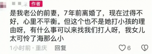 视频里打人的是她老公的前妻,二人已经离婚7年,现在过得并不好心里有怨气,女子直言有事冲着大人来啊,别对自己的女儿下手,很心痛。