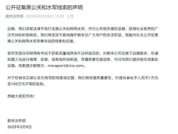 此前李斌在直播中表示,现在造谣成本比较低,蔚来还是希望依法打击造谣和抹黑,但网络取证的难度很大,希望大家帮助提供线索。同时他还"策反"水军:"与其做这种又辛苦又犯法的事情,不如给蔚来法务部提供线索,肯定比做水军赚得多。"