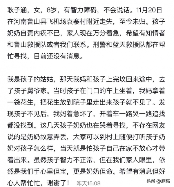 耿子涵走失的消息在网上传播扩散后,引发众多网友关注,有部分网友指责老人看护不当。对此,孩子的姑姑于11月24日在社交平台公开发声,表示孩子走失后,老人自责内疚不已,"我妈着急坏了,开着车一路哭一路追,都没找到。这几天她也在急切寻找,不存在网友说的是奶奶故意弄丢。当天就是怕孩子自己在家不放心才带着出来,虽然孩子智力不正常,但在我们家人眼里,依然是手心里的宝"。