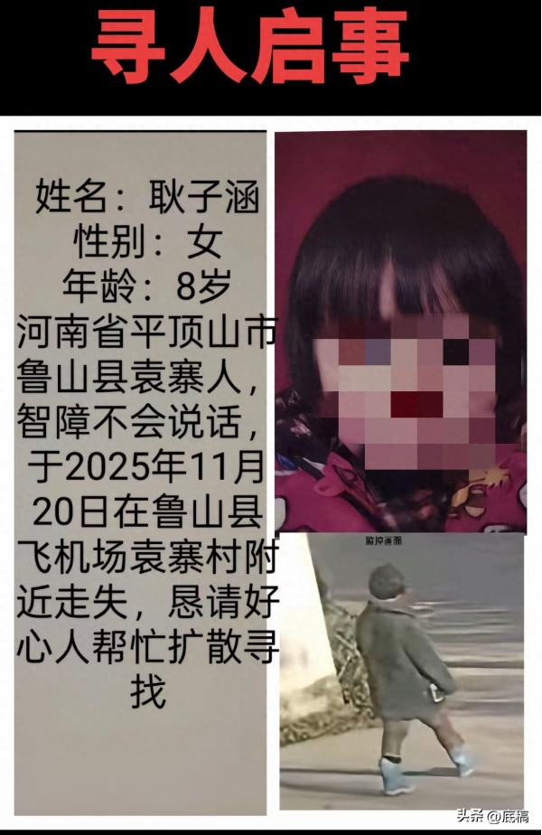 近日,河南鲁山县8岁小女孩耿子涵走失的消息在网上传播。寻人启事显示,小女孩今年8岁,因智力障碍不会说话,于11月20日下午4时左右,在鲁山县飞机场袁寨村附近走失。
