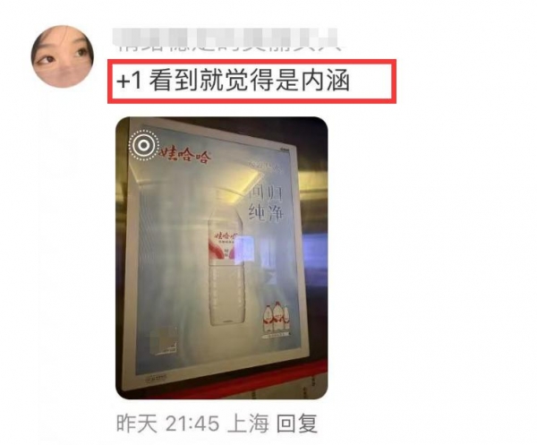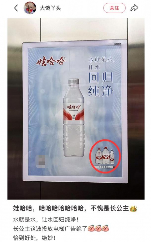 更绝的是,宗馥莉大批量的投放,好多小区的电梯里都换上了新包装,右下角还多了三瓶水。