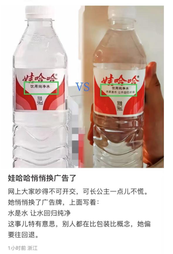 不过,有网友发现,就在大家热议个不停时,宗馥莉一点儿都不慌,她悄悄更换了娃哈哈外包装,加了一句广告语:"水就是水,让水回归纯粹。"