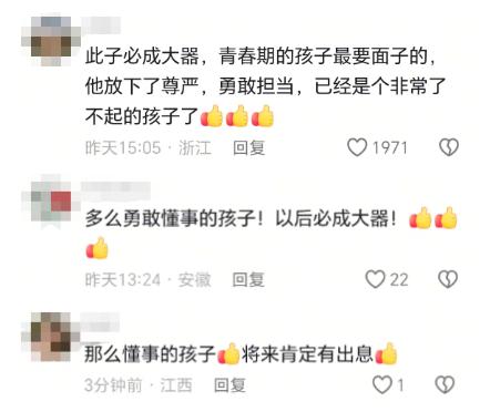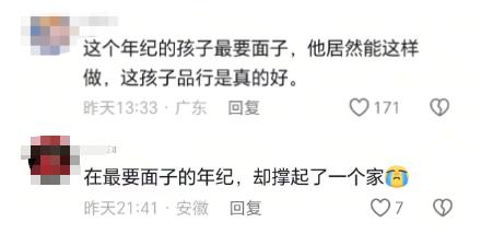他的留言被发上网后,无数网友被感动,纷纷为这个"留言求瓶"的孩子加油,说"这一块黑板,写满了最朴素的孝心"、"在青春期最要面子的年纪,他撑起了一个家"、"勇敢懂事,必成大器"。