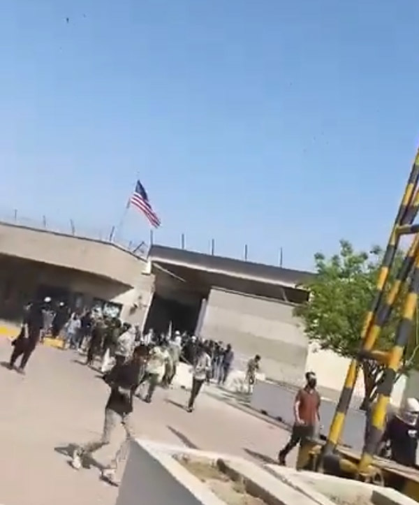 社交媒体上流传的视频显示,美国驻卡拉奇领事馆的抗议现场响起枪声,示威者逃离 视频截图