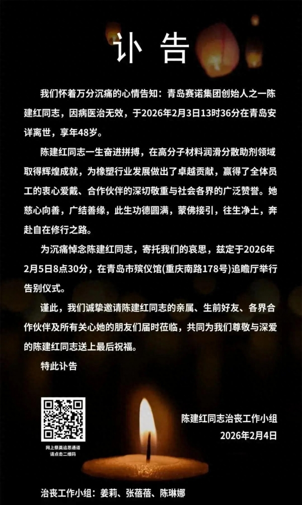 消息来得太过突然。据媒体2月4日报道,青岛赛诺集团正式发布讣告,公司创始人之一陈建红先生,因病医治无效,于2026年2月3日13时36分永远地离开了。