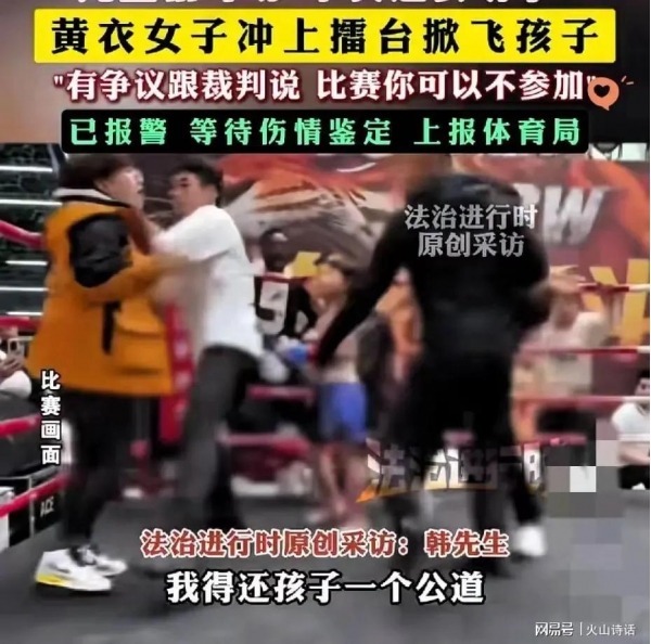 近日网上在传一段视频,说是儿童格斗比赛现场出事了。有个黄衣女子冲进擂台把孩子掀飞了,家长在旁边吵得不可开交。现在警察已经到场,孩子伤情还在鉴定,事情报到了体育局那边。