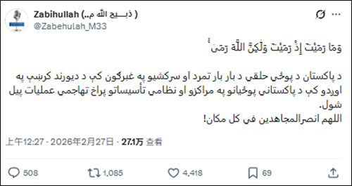 阿富汗政府发言人穆贾希德27日凌晨在社交媒体上证实,阿富汗首都喀布尔、坎大哈省和帕克蒂亚省部分地区遭到巴基斯坦军队空袭,目前尚无人员伤亡报告。他在X平台上写道:"针对巴基斯坦军方反复的挑衅与侵犯,我们已对杜兰德线沿线的巴基斯坦军事阵地和设施发起了大规模进攻行动。"