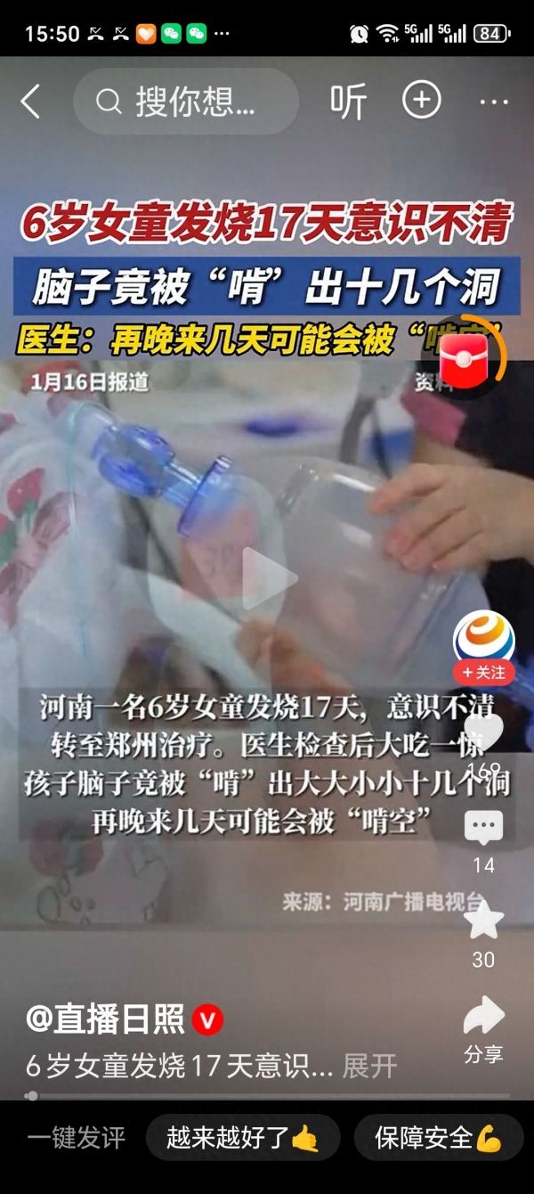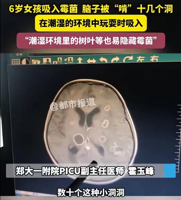 "孩子只是发烧,怎么会伤到脑子?"河南郑州一位母亲抱着昏迷的女儿,在医院走廊里崩溃大哭。6岁女童朵朵(化名)持续发烧17天,起初以为是普通感冒,直到出现意识模糊、抽搐不止的症状,家长才紧急送医。检查结果让所有人倒吸一口凉气:朵朵的脑部竟被霉菌"啃"出十几个大小不一的病灶,再晚一步,大脑可能被彻底侵蚀,后果不堪设想。