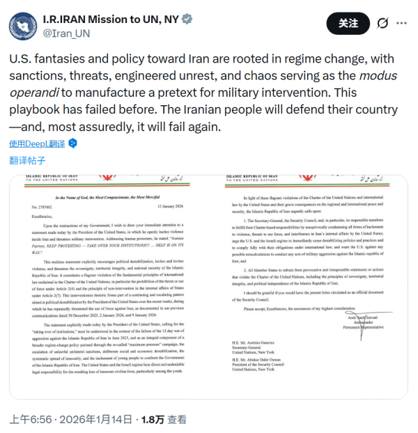 对特朗普的这一表态,伊朗常驻联合国代表团则很快在社交媒体"X"上发表声明称:"美国对伊朗的幻想与政策根植于政权更迭,其惯用手法是通过制裁、威胁、制造动荡和混乱来炮制军事干预的借口。这套剧本早已屡试不爽。伊朗人民必将捍卫自己的国家--而这场阴谋注定再次失败。"