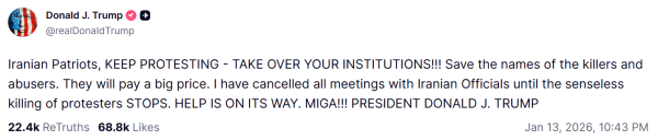 与之相对的是,美国总统特朗普当地时间13日在其社交媒体上发帖,号召伊朗人继续抗议并"接管"当地的官方机构。特朗普在帖文中声称"援助即将到来"。而在接受记者采访时,特朗普表示伊朗的情况非常糟糕,而美国"将采取相应的行动"。他向媒体提到了美国在2025年对伊朗核设施发动的空袭,但没有详细说明更多细节。